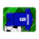 A stylish and modern sports design for any football or soccer fan featuring a soccer jersey with customizable text for the name and number of the soccer player, football fan or soccer coacht. It also features a modern green background representing grass on a soccer field and a soccer ball.