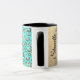 On this design is a gold metallic sheen on the side of the mug where you can personalize it then a glittery sparkly pattern that blends into a glittery leopard print with a blue turquoise backdrop for contrast. Trendy chic modern vibes.