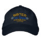An all star Personalized Sister of the Groom Embroidery in gold and blue on a custom baseball cap. A perfect last minute gift idea. Personalize this custom embroidered hat with your name or text using the editable text field on this product page. A personalized wedding party sure to make an impression on or off the aisle.