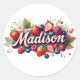 Add a sweet and personal touch to gifts, party favors, or packaging with this round sticker featuring the name Madison in elegant 3D script. Surrounded by juicy strawberries, blueberries, raspberries, and soft watercolor florals, this design brings charm and whimsy to any occasion.