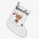 Perfect! Exactly what I ordered! I uploaded a picture of my blue chow, and the screen print was incredible. the back side of the stocking was the red and black checkered print. my puppy's name was also printed on the cuff of the stocking. PERFECT! Highly recommend this product! My puppy's name was screen printed onto the cuff of the stocking, the font was perfect!