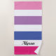 This stylish beach towel is decorated in bold stripes of pink, purple, blue and white with black typography.