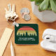 Cool custom sunset keychain in beautiful forest green. Cool personalized family lake house gift for your log cabin customized with your last name under the trees.