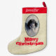 Perfect! Exactly what I ordered! I uploaded a picture of my blue chow, and the screen print was incredible. the back side of the stocking was the red and black checkered print. my puppy's name was also printed on the cuff of the stocking. PERFECT! Highly recommend this product! My puppy's name was screen printed onto the cuff of the stocking, the font was perfect!