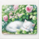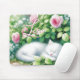 Sweet white kitten sleeping under a rose bush full of pink roses with name. Ai art done in a watercolor style.