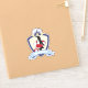 The product design features a crest with a penguin standing with a red and white inner tube and beach ball. This adorable wild animal illustration with personalized text makes cute and unique vinyl stickers for kids.