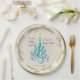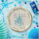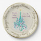 Beautiful paper plate with an original digital painting by Leslie Sigal Javorek of a swirly turquoise Christmas tree w/ violet ornaments on a Trompe L'oeil (trick of the eye) background illusion of fine bone china & greater depth. 2 custom text fields to personalize plate for a great gift.