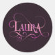 Personalized Swirly Script Laura Pink on Purple Classic Round Sticker
