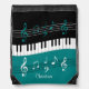 A contemporary design featuring a cool and eye-catching piano music design featuring piano keys in a waving motion in the center with teal and black musical notes scores above and below in alternating colors just add name to create a unique personalized drawstring backpack
