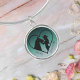 Enjoy this personalized bracelet with a silhouette of a horse and girl which allows you to customize the name of the horse and owner. This design features a teal gradient background which compliments the silver of the bracelet. This would make a wonderful gift for a horse owner, or a memorial gift to remember a loved pet.