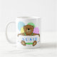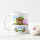 Cute teddy bear holding banner sign personalized with name. Pastel color circles in background