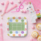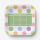 Creative tennis themed party or event plates featuring tennis court art and colorful tennis balls pattern. To customize edit text to add name.