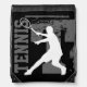 Personalized tennis player drawstring backpack bag. Sporty bag for men women and kids, team, coach and fan. Tennis player silhouette with letter T monogram.