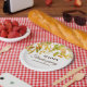 These Thanksgiving paper plates are decorated with watercolor leaves in fall shades and stylish brown script typography.