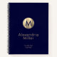 Modern to-do list journal features an elegant monogrammed design on classic navy blue background. Custom monogram initial and name in stylish simple font with a complimentary brushed metallic gold monogram medallion.