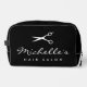 Personalized toiletry bag for hair salon stylist. Elegant black and white design with barber scissors logo. Add your own custom (business) name and colors. Printed on two sides. Perfect for tools, grooming toiletries and more.