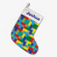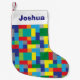 A pattern of toy bricks in a rainbow of colors - red, orange, yellow, blue, green, red and gray. Personalize this Christmas holiday stocking with a boy's name.