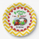Train theme 3rd birthday paper plates features a locomotive, cars, and caboose on an oval train track with steam with text that reads Choo Choo! A bright yellow and white chevron stripe border edge with red circular trim, green, red, and yellow text that reads Birthday Fun I am 3 Today, and an area you can add the birthday child's name before ordering makes these train theme paper plates a great fit for that train theme third birthday party!