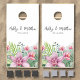 Bride Groom Modern Elegant Tropical Floral Wedding Cornhole Set. A great way to have fun during cocktail hour, or at your beach wedding reception. A tropical design that embraces the tranquil beauty of nature mixed with a playful edge that is sure to help you have fun. A blend of calming green tropical leaves, including banana leaves, palms, monstera leaves, and pink princessa plants, alongside soothing purple-pink orchid flowers, intertwined with various other foliage. Enhanced by a modern handwritten or script typography font, this enchanting print radiates charm and sophistication. This versatile design brings a sense of tropical paradise to any setting or special occasion, making it perfect for a destination wedding, or just when you want to add a tropical flare.
