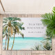 Welcome guests with tropical vibes! This personalized door mat features watercolor palm trees, a blue beach scene, and coastal charm for your beach house decor.