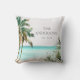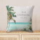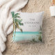 Bring tropical charm to your space with this personalized throw pillow! Featuring watercolor palm trees, a blue beach scene, and coastal vibes for beach house decor.