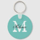 Personalized turquoise blue name monogram keychain. Vintage initial letter with elegant script typography. Cute favor gift idea for trendy women and girls. Make your own monogrammed present for stylish wedding, bridal shower, bachelorette, girls weekend, engagement, anniversary, birthday etc. Fun for bride to be, bridesmaid, maid of honor, flower girl, mother of the bride, mother of the groom etc. Aqua and white.