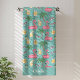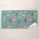 This summer-themed bath towel design is complete with a seamless pattern of flamingo pool floaties, pitchers of lemonade, sunglasses, and palm trees set against a turquoise blue background. There is a place to add your name at the bottom of the towel.