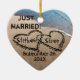 FYI: The heart shape ornament with this design is now available in acrylic. Easily add your own custom names or any text (shown example says: "Just Married" with names of the bride and groom in the hearts and the date) to personalize this beautiful popular heart shape ornament with an original photo of two hearts written in the sand along the blue ocean water to signify love and romance. Great concept for love, travel, first Christmas holiday together, and upcoming summer save the date weddings. A fun, cute, personal and unique keepsake ornament to give to that special someone, girlfriend or boyfriend, bride and groom or any sweethearts couple. This design is on both sides and is available with the design on one side as well.
