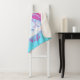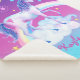 This personalized Sherpa blanket shows a mythical, majestic pink, purple, and blue unicorn standing on puffy white clouds in a unicorn cotton candy pink, purple, and aqua sky with a rainbow beaming in from the side. There are shooting stars in teal blue and pink, along with yellow and aqua blue stars in the background. Add your name or other text along the bottom.