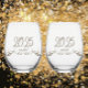 Celebrate the New Year with unique style and a keepsake to remember it. My original designed silver golden wisps of streamers radiate from both sides of the script, "Happy New Year". The year 2025 written in editable fun large font is displayed in the center of these stemless wine glasses. On the back is customized bronze toned script to add your names or the location or other text to suit your desires. This one-of-a-kind design has a gradient faux metallic look but is not real foil. These would be great for a New Years Eve Party, or a New Years Eve dinner, or a simple romantic dinner with your spouse. Modern, trendy, simple elegance for your celebration.