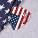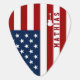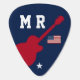 The striped red and blue american-flag, with a silhouette of a guitar and the name of the guitarist or the rock-band... for those about to rock... a cool patriotic design to personalize in the american-colors