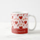 This fun coffee mug features whimsical heart pattern in red and pink, and personalized with your name.