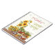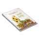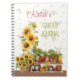 Vegetable and flower gardening journal, personalized with name on the front. Sunflowers and vegetables on wooden shelves is the design with two places for custom text. Butterflies and bees cover the background, which is off-white. This spiral-bound notebook can be used for garden, or market notes, planting dates, ideas and plans, and harvest successes.