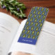 Keep your place with a touch of eye-catching elegance using this stylish bookmark! It features a rich geometric pattern of vibrant peacock feathers in shades of deep blue, lush green, and shimmering gold, overlaid with a bright green diamond grid. A coordinating deep blue band at the bottom provides space for a personalized name in crisp white lettering. A truly beautiful way to mark your reading!