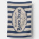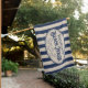 Show your love for your beachside abode with our custom family name house flag. Vintage style design features your family name and year established flanking "beach house" in retro navy blue lettering adorned with a rope illustration, on a navy blue and tan striped background.