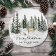 This holiday round pillow features winter forest with deer family and snow and personalized with your custom text. Back features snow overlay on dark green background.