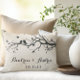 Lovely simplicity-oriented silhouette love birds on sprouting branches Couple's Names Wedding Date Anniversary keepsake Vintage Accent Pillow design.