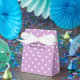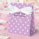 Personalized wedding favor box. Lavender purple print with white polka dots pattern. Custom thank you message from bride and groom. Cute polkadot print with elegant white ribbon bow. Customizable background color.