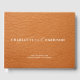 A simple elegant couple's wedding name monogram with date and location, on a colored faux leather effect background. Simple classic elegance. Wedding guest signing keepsake book. Elegant ancient serif type modeled on Roman engraving style, with script ampersand.