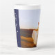 Savor your morning coffee or tea with this stylish and personalized Navy Blue Latte Mug. Featuring your favorite wedding photo with your names in a modern sans serif font on a navy blue banner, this latte mug is perfect for enjoying your daily cup of joe or giving as a thoughtful wedding or anniversary gift.