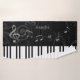 A whimsical musical design with curved piano keyboard keys and musical notes on a subtle flourish pattern in gray on a black background. Ideal for the pianist, piano student or the music lover. Name personalization appears on the bath and hand towel