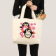 Two adorable penguins dressed in pink and orange scarf, hat, and mittens surrounded by pink hearts and snowflakes on a tote bag kids are sure to love. This penguin tote bag is easy to customize with a name!