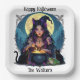 A pretty witch, a black cat, a frog and a cauldron Halloween party paper plates in black, purple and orange.