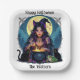 A pretty witch, a black cat, a frog and a cauldron Halloween party paper plates in black, purple and orange.