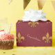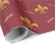 This personalized wrapping paper features a faux wood Fleur de Lis symbol on a rich Bordeaux red background. Click Customize It to choose your font and font color or to change the text placement.