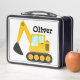 A personalized lunch box for your boy who loves yellow backhoe truck loader construction vehicles. You can change the text, font style, and color.