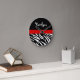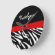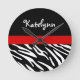 Trendy and cute personalized zebra stripes wall clock features white zebra stripes and a red accent border on a black background. Personalize with your name, initials or other text. Click the "Customize it!" button to change the font size, font color, font style and more!
