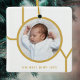This modern Christmas Photo Ornament is decorated with the word JOY in gold on a white background.