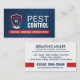 A clean and professional business card design for pest control technicians and small extermination businesses. The front features a bold red-and-blue shield graphic with a subtle insect motif, paired with strong typography: