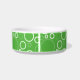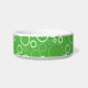Pet bowl shown in white with a accent print in a green circles pattern.